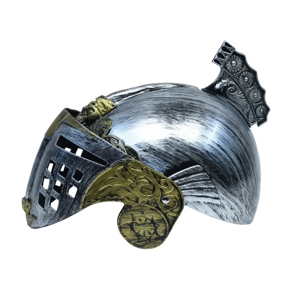 Bu Romalı Bizans kaskı miğferi, Gümüş ve Altın renkleriyle göz alıcı bir görünüme sahiptir. 25x20 cm boyutlarındaki bu miğfer, yetişkinler için standart ölçüdedir ve oynar başlıklıdır.