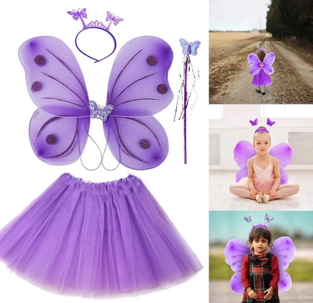 Lila Mor Kelebek Kostümü - Lila Mor Kelebek Kostüm Aksesuar Seti 4 Parça