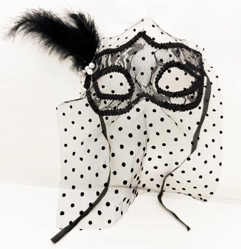 Siyah Renk Siyah Puantiyeli Duvaklı İncili Parti Maskesi